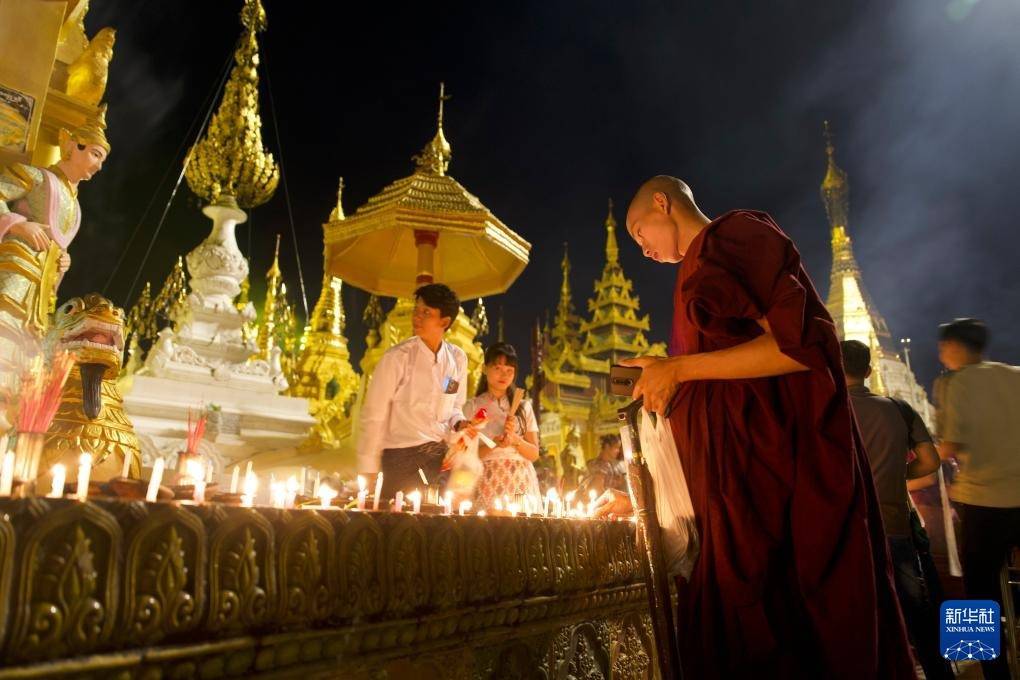 10月6日,民众在缅甸仰光大金塔庆祝点灯节。新华社发(苗觉梭摄)