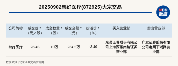 每经讯,2025年9月2日,北交所上市公司锦好医疗(872925,收盘价:29.48元)发生一笔大宗交易,成交价28.45元/股,成交数量10万股,成交金额284.5万元,折价3.49%。买入营业部是东吴证券股份有限公司上海西藏南路证券营业部,卖出营业部是广发证券股份有限公司惠州下埔路营业部。
