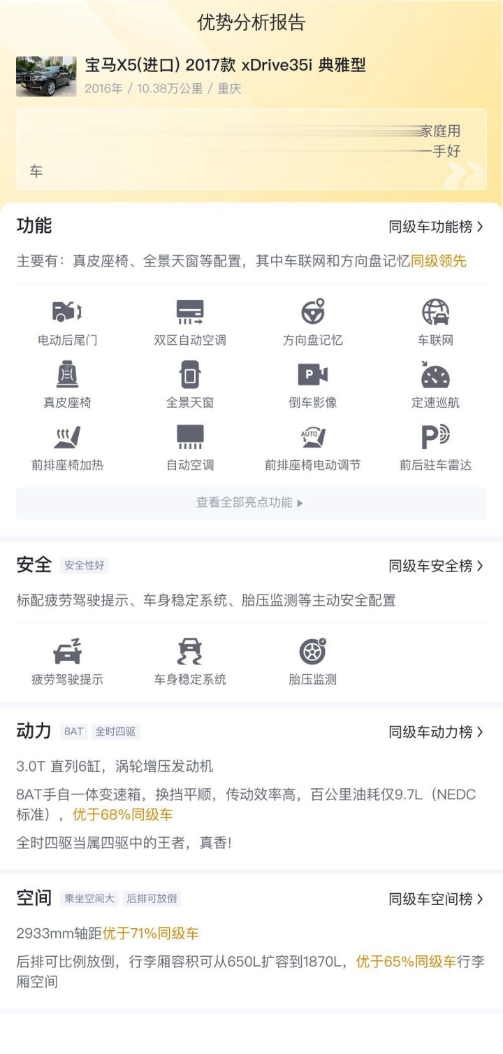 先介绍一下这辆车的基本信息,该车具体版本是——宝马X5(进口) 2017款 xDrive35i 典雅型。该车的定位是中大型SUV,车身外观颜色为黑色,内饰是深色配色。车源地在重庆,上牌地是长春。2016年5月首次上牌,在此期间过户0次。同时至今累计行驶里程是10.38万公里,该车符合国V排放标准。新车含税价为91.47万,而现在的二手车报价是16.98万。